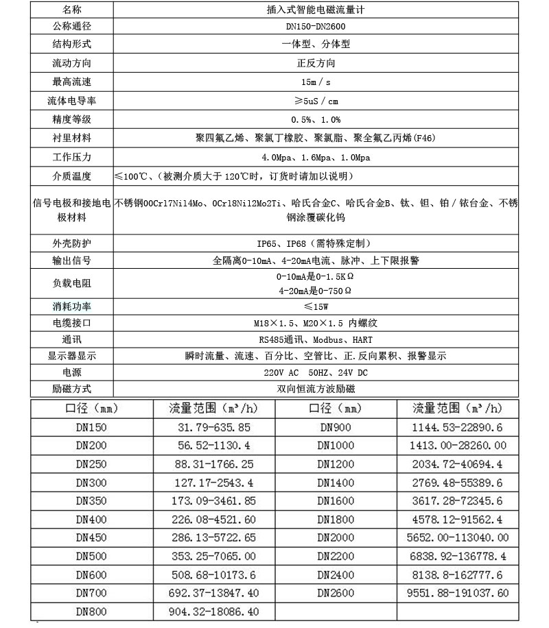 插入式電磁流量計是根據法拉第電磁感應定律進行流量測試的流量計。電磁流量計的優點是壓損極小,可測流量范圍大。最大流量與最小流量的比值一般為10:1以上,適用的工業管徑范圍寬,最大可達3m,輸出信號和被測流量呈線性,精確度較高,可測量電導率≥5μs/cm的酸、堿鹽溶液、水、污水、腐蝕性液體以及泥漿、礦漿、紙漿等流體流量。