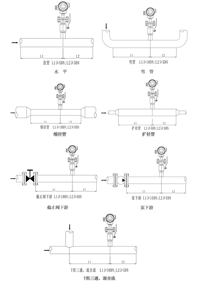 使用直管段可防止介質因彎管、TT型三通、截止閥、變徑管的影響而產生渦流或失真