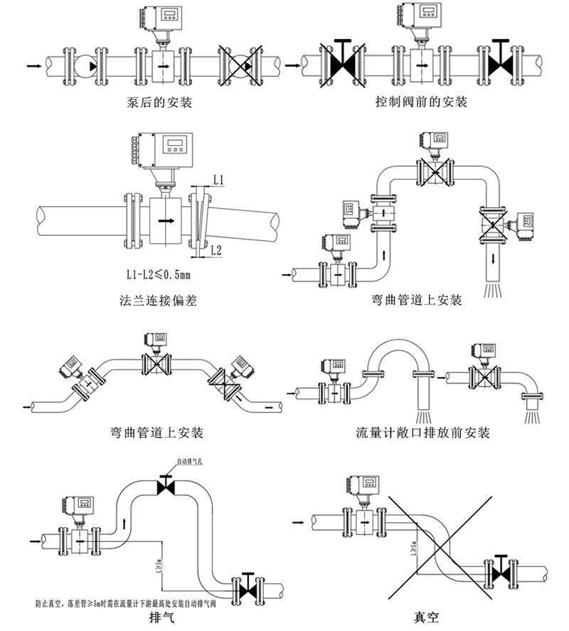 通用要求 a.為了安裝、維護、保養方便,在流量計周圍需保留足夠的空間 b.避免流量計安裝在溫度變化很大或受到設備高溫輻射的場所 c.流量計應安裝在室內,如安裝在室外,應避免陽光直射,必要時請安裝防曬裝置 d.避免流量計安裝在含有腐蝕性氣體的環境中 e.避免流量計安裝在有強振動源、強磁場的場所 工藝管要求 a.上、下游工藝管的內徑與流量計的內徑應滿足:0.98DN≤D≤1.05DN(DN:流量計 內徑;D:工藝管內徑) b.工藝管與流量計需同心,同軸偏差不大于0.05DN