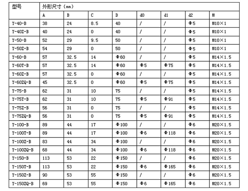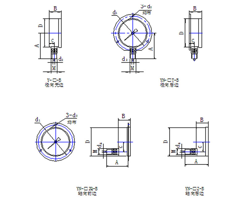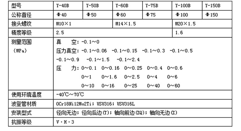●徑向全不銹鋼壓力表精度 ±2.0% ●表殼尺寸 100mm(4.25英寸) ●表殼材質 304不銹鋼 ●表殼形式 安全殼構造,隔板裝置后釋放 ●及接體 316不銹鋼管同316不銹鋼接體氬弧焊接 ●機芯 316不銹鋼 ●連接形式 M20×1.5 或 1/2 NPT 底部連接,或背部連接(徑向全不銹鋼壓力表/軸向全不銹鋼壓力表) ●測量范圍 -0.1~0 MPa,0.1~100MPa,160MPa,350MPa ●指針 普通 ●表玻璃 有機玻璃、安全型雙層玻璃全不銹鋼壓力表 ●充填材質 甘油98%(可選擇硅油、氟油或其它類別) ●防護等級 IP 65 ●溫度環境及工作介質溫度不應超過: ●充液型徑向全不銹鋼壓力表 0~140℉; ●普通型徑向全不銹鋼壓力表 -46~145℉