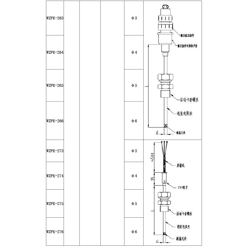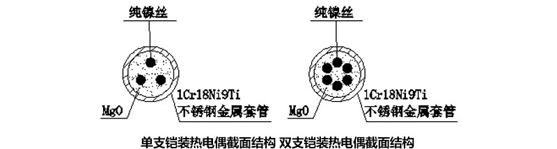 鎧裝熱電阻的結構,除五部中的測溫元件、絕緣材料、保護套管三部分構成鎧材整體以外,其余與常規熱電阻的結構相同。鎧材(測溫元件、絕緣材料 、保護套管):測溫元件對熱電阻來說是感溫元件及其內引線;各熱電阻引線之間,及其與保護套管之間用氧化接作絕緣材料;用金屬管保護絕緣材料和測溫元件。鎧材工藝使測溫元件、絕緣材料、保護套管三者成為一個不可拆卸的可撓的緊密實體,鎧材是制造鎧裝熱電阻的基體材料, 鎧材不能直接用于測溫,必須制作測量端和簡易接線端后方可作為基型鎧裝熱電阻使用。