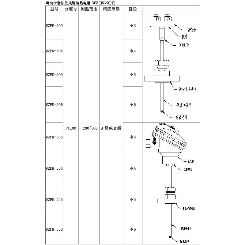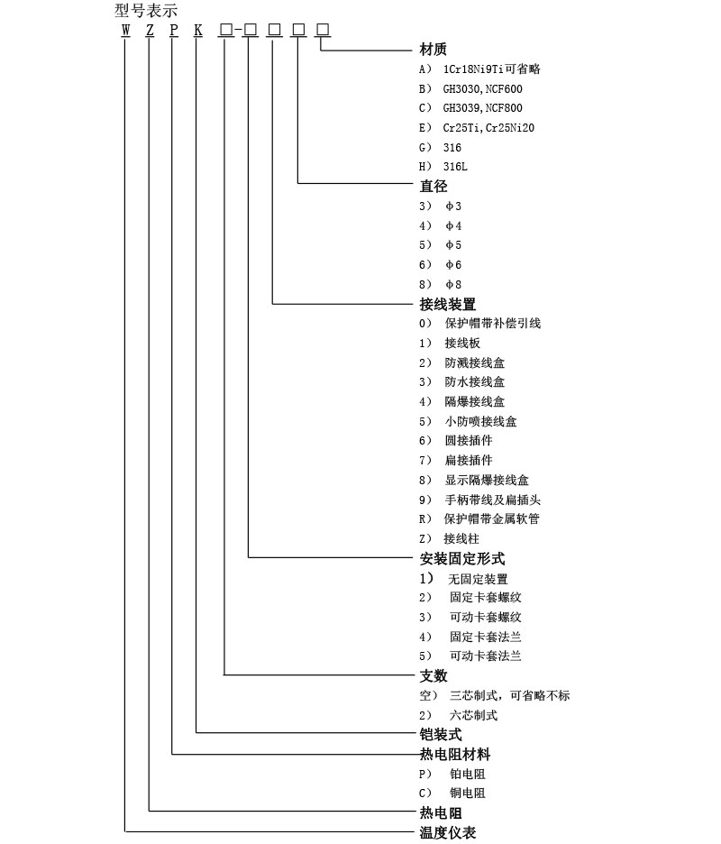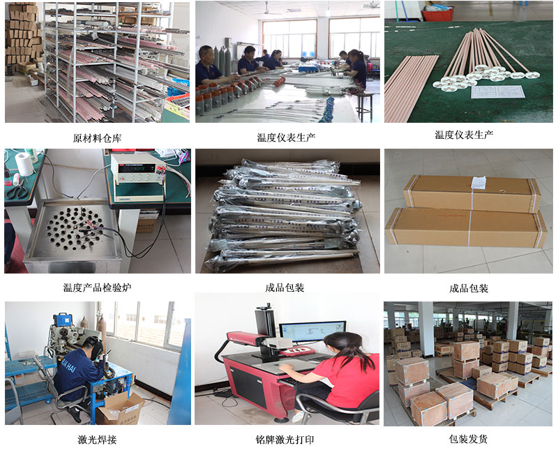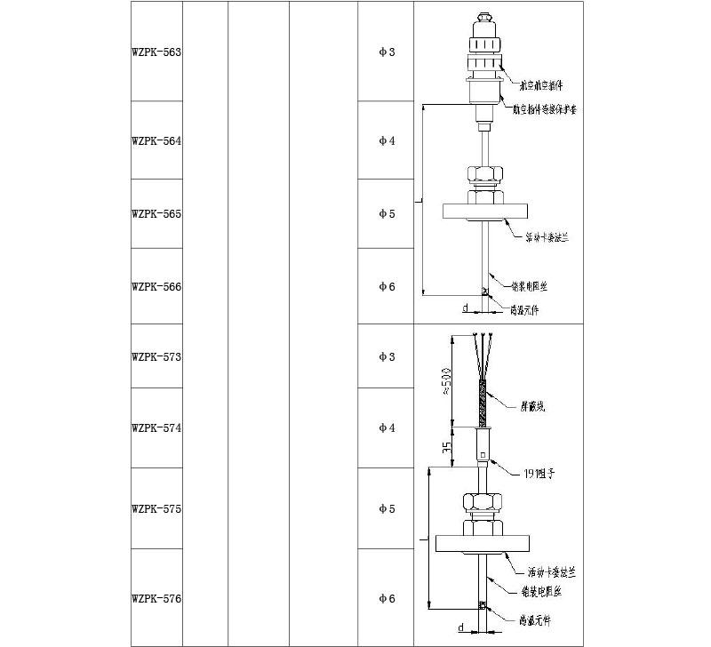 鎧裝熱電阻的結構,除五部中的測溫元件、絕緣材料、保護套管三部分構成鎧材整體以外,其余與常規熱電阻的結構相同。鎧材(測溫元件、絕緣材料 、保護套管):測溫元件對熱電阻來說是感溫元件及其內引線;各熱電阻引線之間,及其與保護套管之間用氧化接作絕緣材料;用金屬管保護絕緣材料和測溫元件。鎧材工藝使測溫元件、絕緣材料、保護套管三者成為一個不可拆卸的可撓的緊密實體,鎧材是制造鎧裝熱電阻的基體材料, 鎧材不能直接用于測溫,必須制作測量端和簡易接線端后方可作為基型鎧裝熱電阻使用。