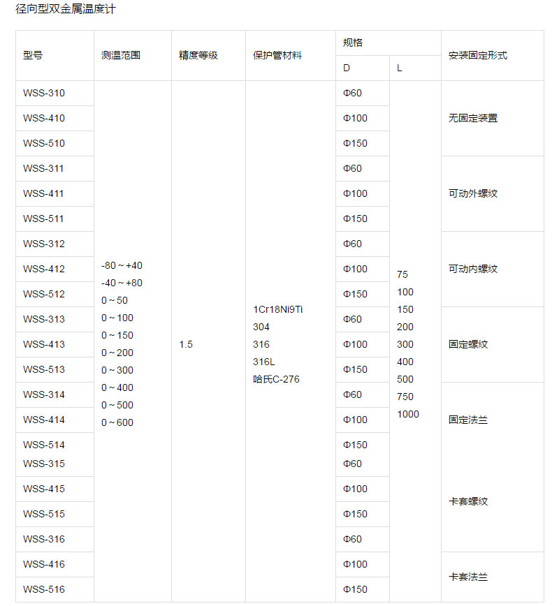 雙金屬溫度計選型須知:請提供型號、表盤直徑、精度等級、安裝固定形式、測溫范圍、保護管材質、長度或插入深度。選型舉例:萬向型雙金屬溫度計,表盤直徑Φ100,測溫范圍0~400℃,1.5級,活動外螺紋M27×2,長度450mm WSS-481, 0~400℃,L=450, M27×2,1.5級