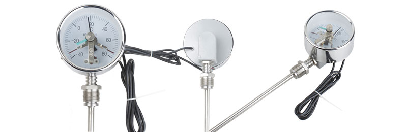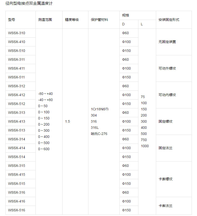 電接點雙金屬溫度計選型須知:請提供型號、表盤直徑、精度等級、安裝固定形式、測溫范圍、保護管材質、長度或插入深度。選型舉例:萬向型電接點雙金屬溫度計,表盤直徑Φ100,測溫范圍0~400℃,1.5級,活動外螺紋M27×2,長度450mm WSSX0-481, 0~400℃,L=450, M27×2,1.5級